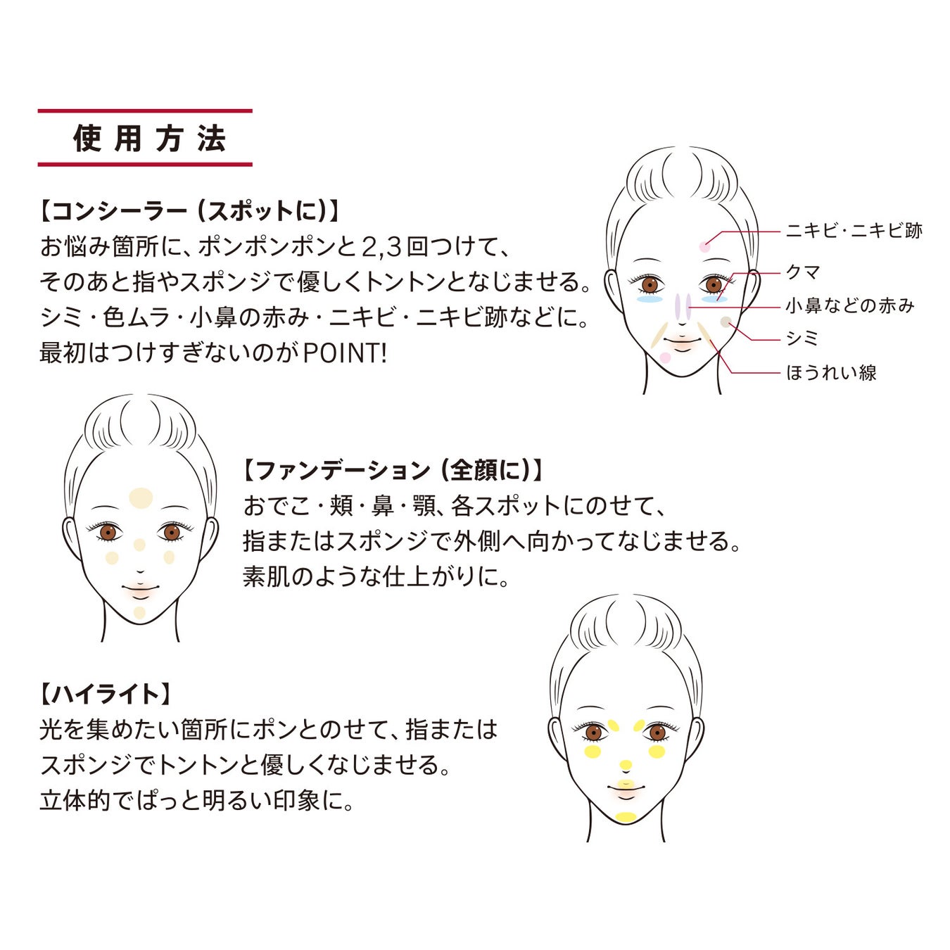 お悩み箇所に、ポンポンポンと2,3回つけて、そのあと指やスポンジで優しくトントンとなじませる。シミ・色ムラ・小鼻の赤み・ニキビ・ニキビ跡などに。