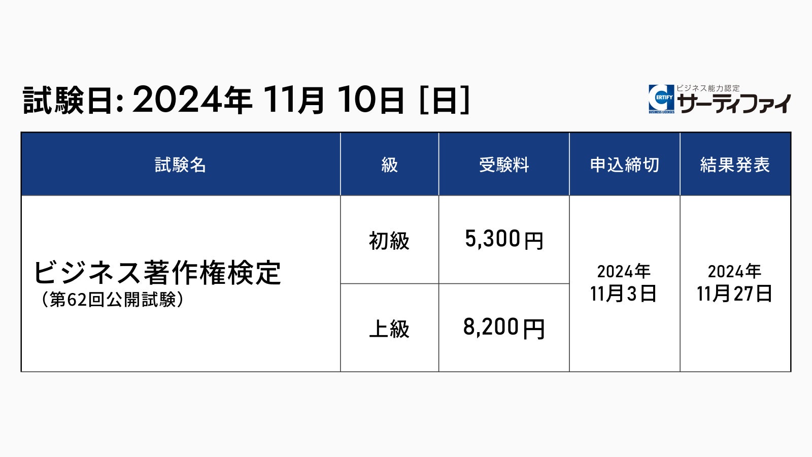 株式会社サーティファイ(本社:東京都中央区、代表取締役:瀧澤茂、以下「サーティファイ」)は、2024年11月10日(日)に開催する「ビジネス著作権検定」の公開試験の申込受付を2024年8月20日より開始しました。