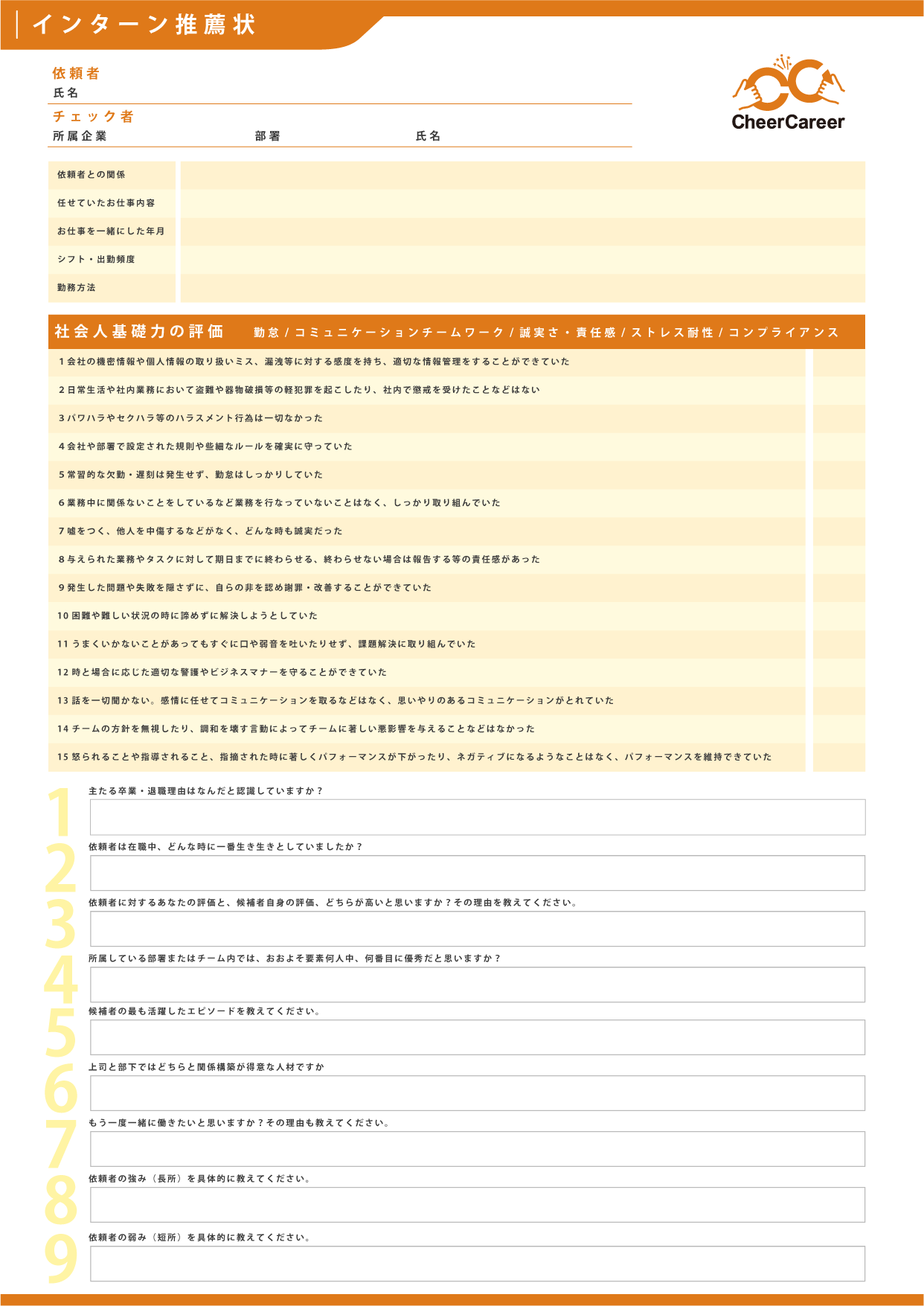 ベンチャー・成長企業のための就活サイト「CheerCareer(チアキャリア)」を運営する株式会社Cheer(本社:東京都新宿区、代表取締役:平塚ひかる)は、インターン先での経験スキル、第三者評価での社会人基礎力を見える化する「インターン推薦状」の発行を開始したので報告いたします。