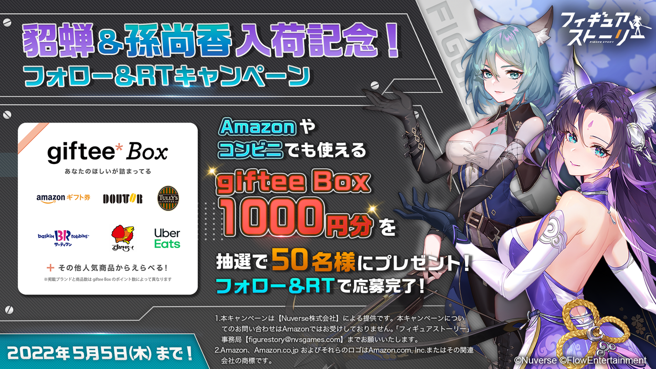 Nuverse株式会社は、運営するスマートフォン向け“フィギュアRPG”『フィギュアストーリー(以下ギアスト)』において、4月29日(金)に新フィギュア(キャラクター)の「貂蝉(CV:夏吉ゆうこ)」と「孫尚香(CV:小原莉子)」、それぞれのスキン(着せ替え)、および関連するシナリオイベントを実装いたします。またその他にもゴールデンウィーク期間中のログインボーナスや期間限定イベントを実施。さらに新フィギュアの実装を記念し、Twitter上で、オリジナルの湯呑みや様々な場所で使えるギフト券が当たるTwitterキャンペーンを行います。