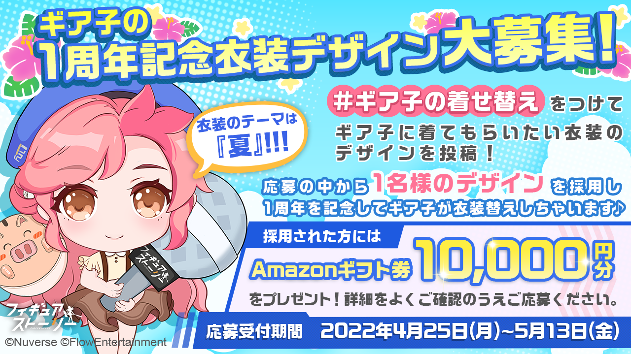 内容:2022年6月にギアストが正式サービス開始1周年を迎えることを記念し、ギアスト公式Twitterアカウントのリポーターである立木亜子(ギア子)の衣装デザイン案を募集いたします。テーマは「夏」。運営事務局が、応募作品の中から1名分のデザイン案を選出し、1周年のタイミングで、採用されたデザイン案に合わせギア子が衣装をチェンジいたします。デザイン案が採用された方にはAmazonギフト券10,000円分をプレゼント!より詳細な応募方法や注意事項等についてはギアスト公式サイトをご確認ください。