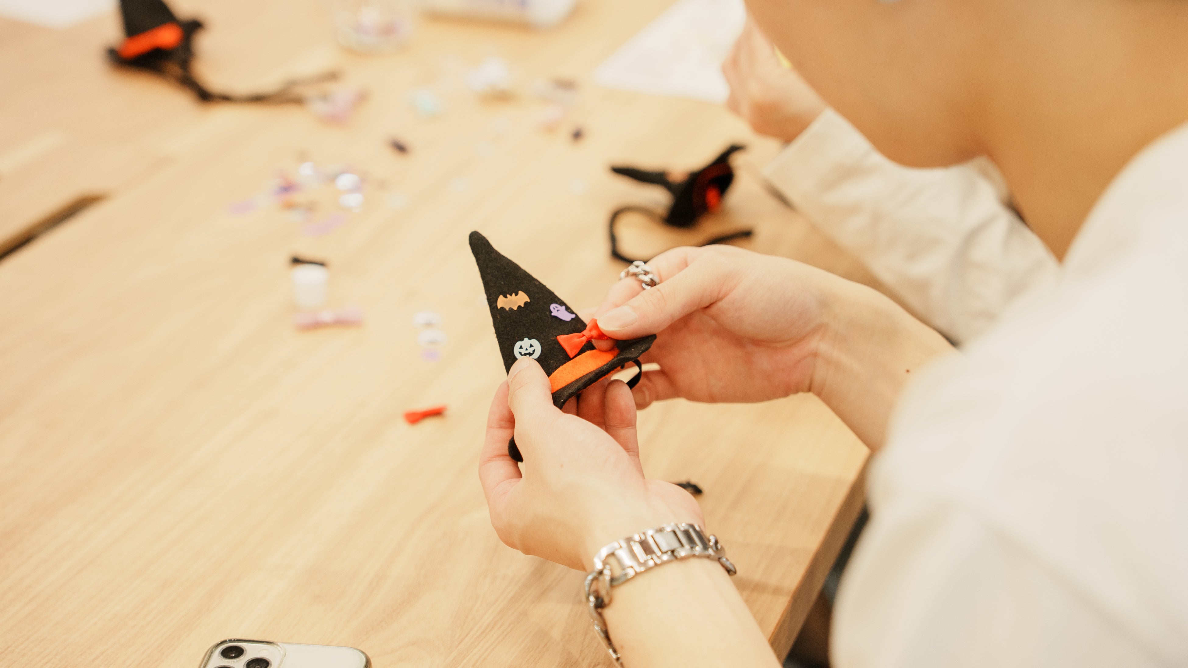 愛犬用のミニ帽子にリボンやパーツを自由に貼り付け、自分好みにカスタマイズしていただきました。