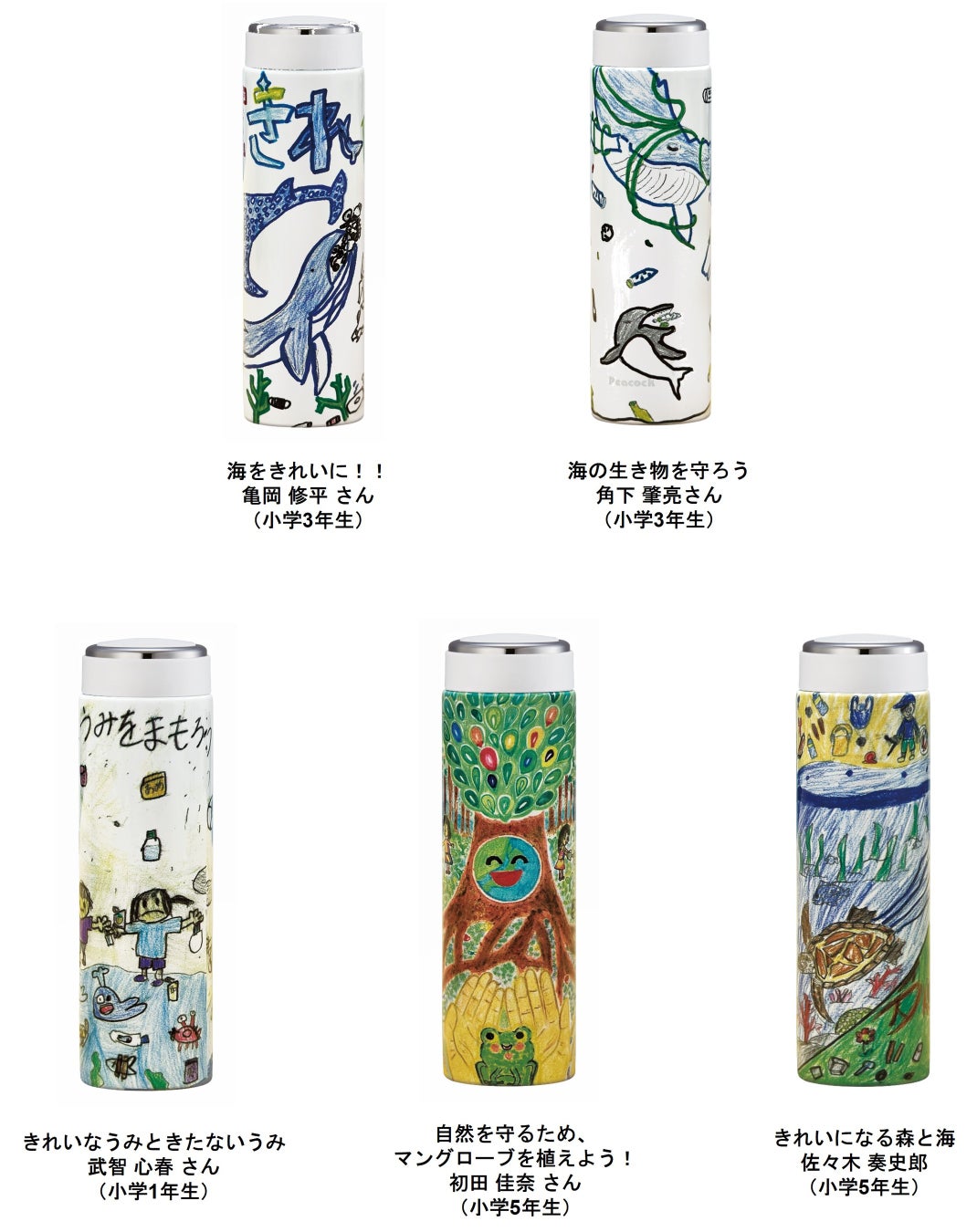 ピーコック魔法瓶工業株式会社(本社:大阪市、社長:山中千佳)は、大阪府主催の「おおさかマイボトルパートナーズ」が企画する「おおさかマイボトルパートナーズ マイボトルデザインコンテスト2024」に協賛し、小学生以下のお子様を対象に「地球を守るために、今から自分で出来ること」をテーマとしたイラストを募集、2024年2月に5名の受賞者に、「ピーコック賞」としてそれぞれの応募イラストが描かれたボトルを贈呈しました。本コンテストが多くのお子様にとって、持続可能な社会について考えていただく機会となればと考えております。
