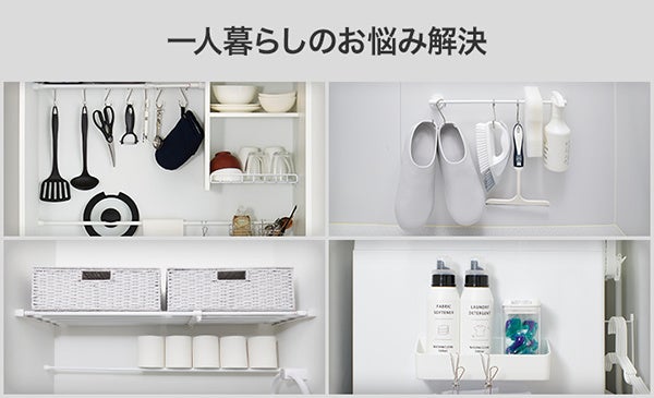 「一人暮らしのお悩み解決」ページでは、「キッチン」「バス・洗面」「トイレ」「ランドリー」といった特に狭いスペースでのお困り事の解決方法を、スペースごとにご紹介しています。