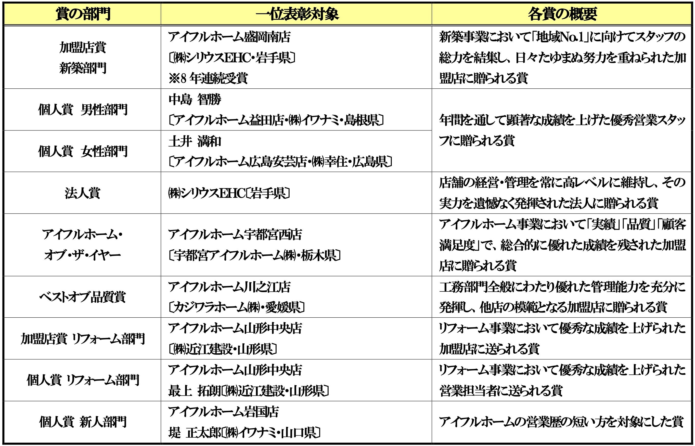 ベストオブ品質賞には、3年連続でアイフルホーム川之江店が、アイフルホーム・オブ・ザ・イヤーは、アイフルホーム宇都宮西店が、加盟店賞 新築部門は、アイフルホーム盛岡南店が8連覇を達成しました。なお、2021年度の各種コンテストの受賞者・受賞店は以下の通りです。