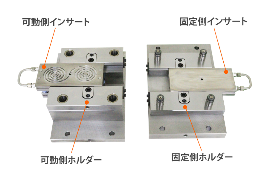 カセット式樹脂試験金型は、金型ホルダーを射出成形機に常時取り付けたまま、固定側・可動側のカセット式インサート(以下、インサート)のみを容易に交換できる構造を採用しています。これにより、試験片ごとに金型一式を載せ替える必要がなくなり、段取り時間を大幅に削減できます。また、インサートを用意するだけで多種多様な試験片に対応できるため、従来の金型製作コストを抑えられるだけでなく、金型保管の省スペース化にも大きく貢献します。