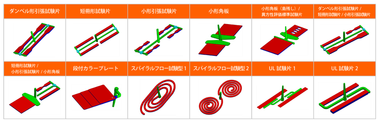 インサートは、JISやUL 94(難燃性評価)などの規格準拠品から、スパイラルフロー(流動性評価)用など、全12種類を標準ラインナップしています。さらに、ゲート形状・位置、抜き勾配、収縮率、ガスベント、センサ位置など、お客様の評価目的に合わせたカスタム仕様にも柔軟に対応します。