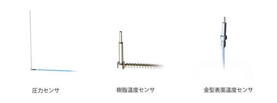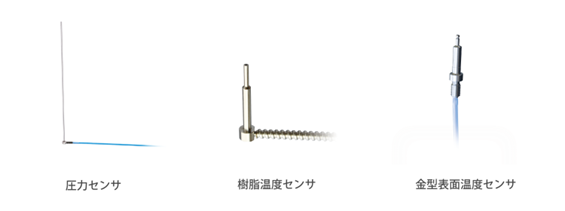 カセット式樹脂試験金型は、目的や用途に応じて当社製の「金型内センサ」を搭載することが可能です。金型内センサを活用することで、金型内の圧力、樹脂温度、金型表面温度などを正確に計測でき、試験片の成形プロセス監視やトレーサビリティ管理を実現できます。また、金型内センサは固定側インサートに搭載できる設計を採用しているため、可動側インサートを別タイプに交換した場合でも同一の計測環境を維持したまま計測できます。