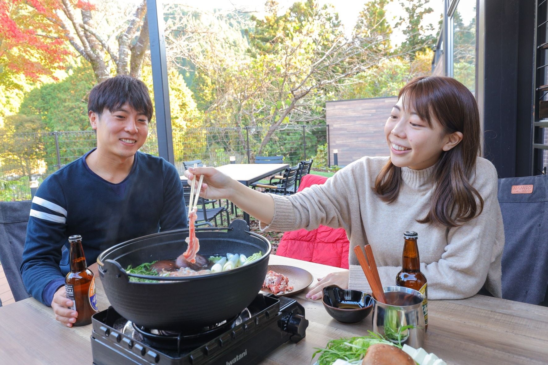 この3年間コロナ禍で制限を受け続けた新成人の皆様に向けて、友人や仲間とお得に熊野古道で泊まれる1月限定のプランをご用意しました。地元で捕獲された猪の肉を使ったしゃぶしゃぶ鍋がついた宿泊プランが、通常料金より20%オフとなります。1棟貸し宿のTAKAHARAでは広々としたリビングで、コンテナホテルのCHIKATSUYUでは防寒グッズが万全に揃えられた屋外こたつで、冬の味覚が詰まったお鍋を味わうことができます。