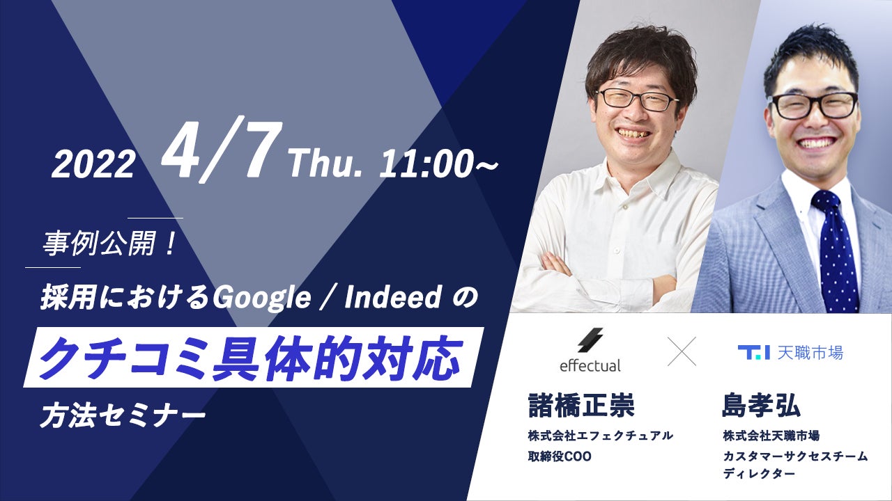当セミナーは、WEB上の評判管理やGoogleビジネスプロフィールの活用コンサルに実績を持つエフェクチュアルとIndeedゴールドパートナーとして運用支援を提供する天職市場が共同開催するもので、採用活動において、Google/Indeedに知らない間に投稿されているクチコミをいかに対策・対応するのか、その具体的手法を解説します。