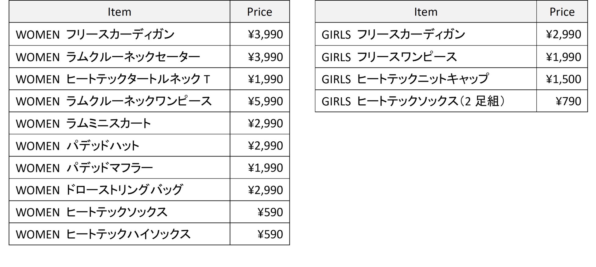 商品ラインナップ:ウィメンズ10アイテム、キッズ4アイテム