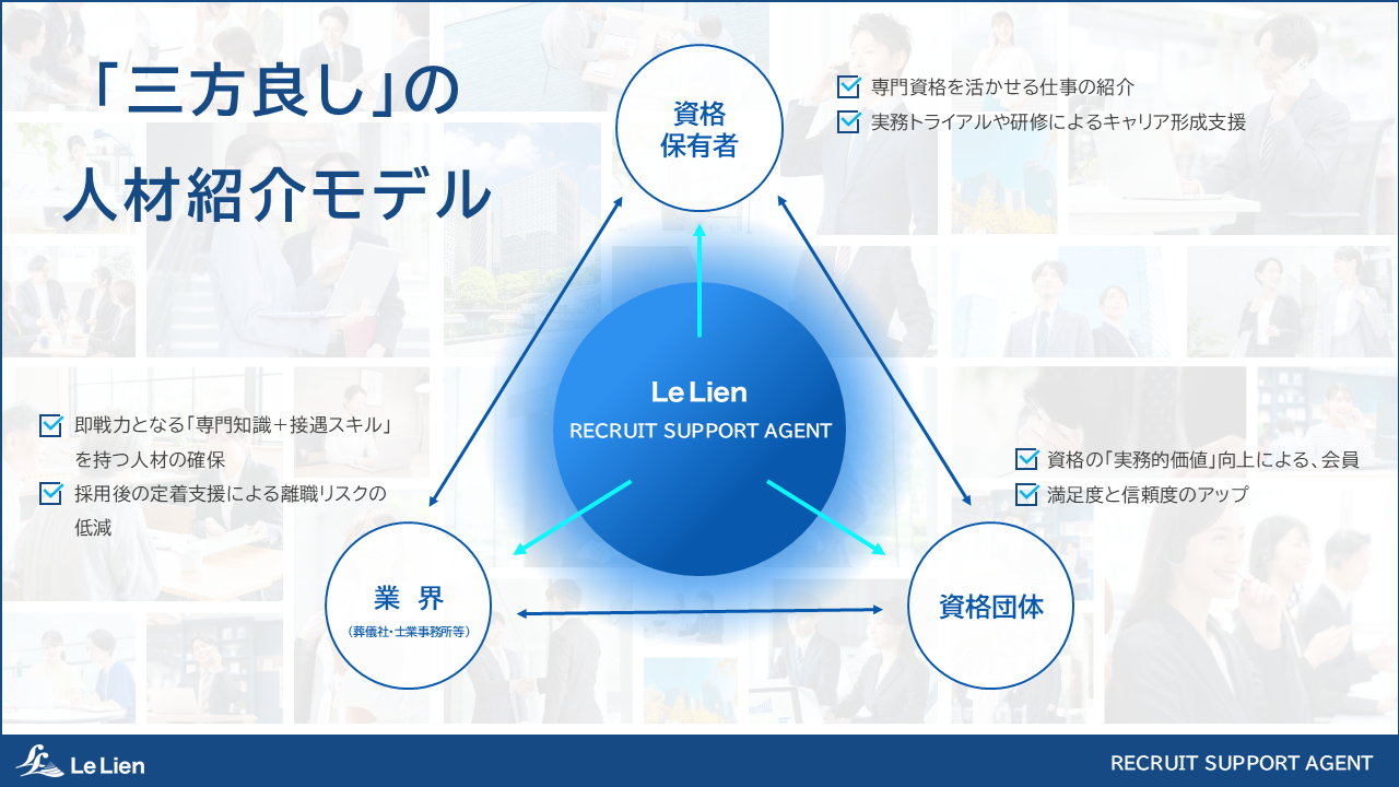 当社は、これまでの事業で培った全国の士業・葬儀社ネットワークと、各種資格団体との提携を活かし、以下の「持続可能な人材紹介モデル」を構築します。