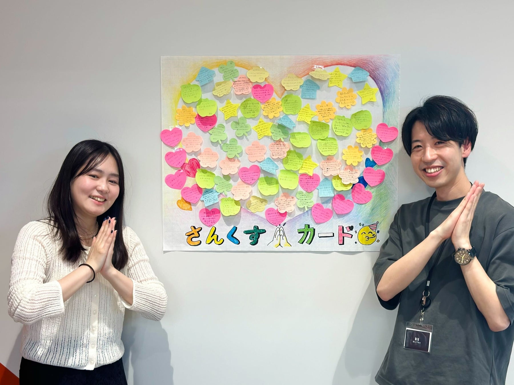 「さんくすカード」では、社員同士が日々の業務の中で感じた感謝の気持ちをカードに記入し、オフィス内のボードに掲示します。気持ちを目に見える形にすることで、互いを認め合う文化をさらに醸成し、部署を超えたメンバー間の関係作りに貢献すると考えています。
