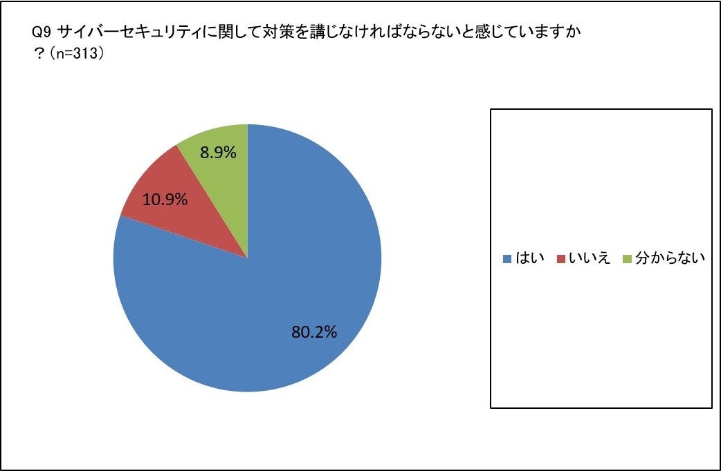 調査結果では「サイバーセキュリティに関して対策を講じなければならないと感じていますか?」という問いに対して「はい」と答えた方が80.1%、「いいえ」と答えた方が10.9%と多くの経営者層が何かしらの対策を講じなければならないという危機感を持っていることが分かりました。