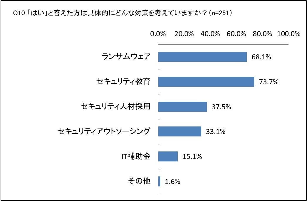 「はい」と答えた方へ具体的にどんな対策を考えているか、という問いに対しては「セキュリティ教育」が73.7%、「セキュリティ人材採用」と「セキュリティアウトソーシング」の人材採用に関する対策が70.6%、「ランサムウェア対策」が68.1%だった。