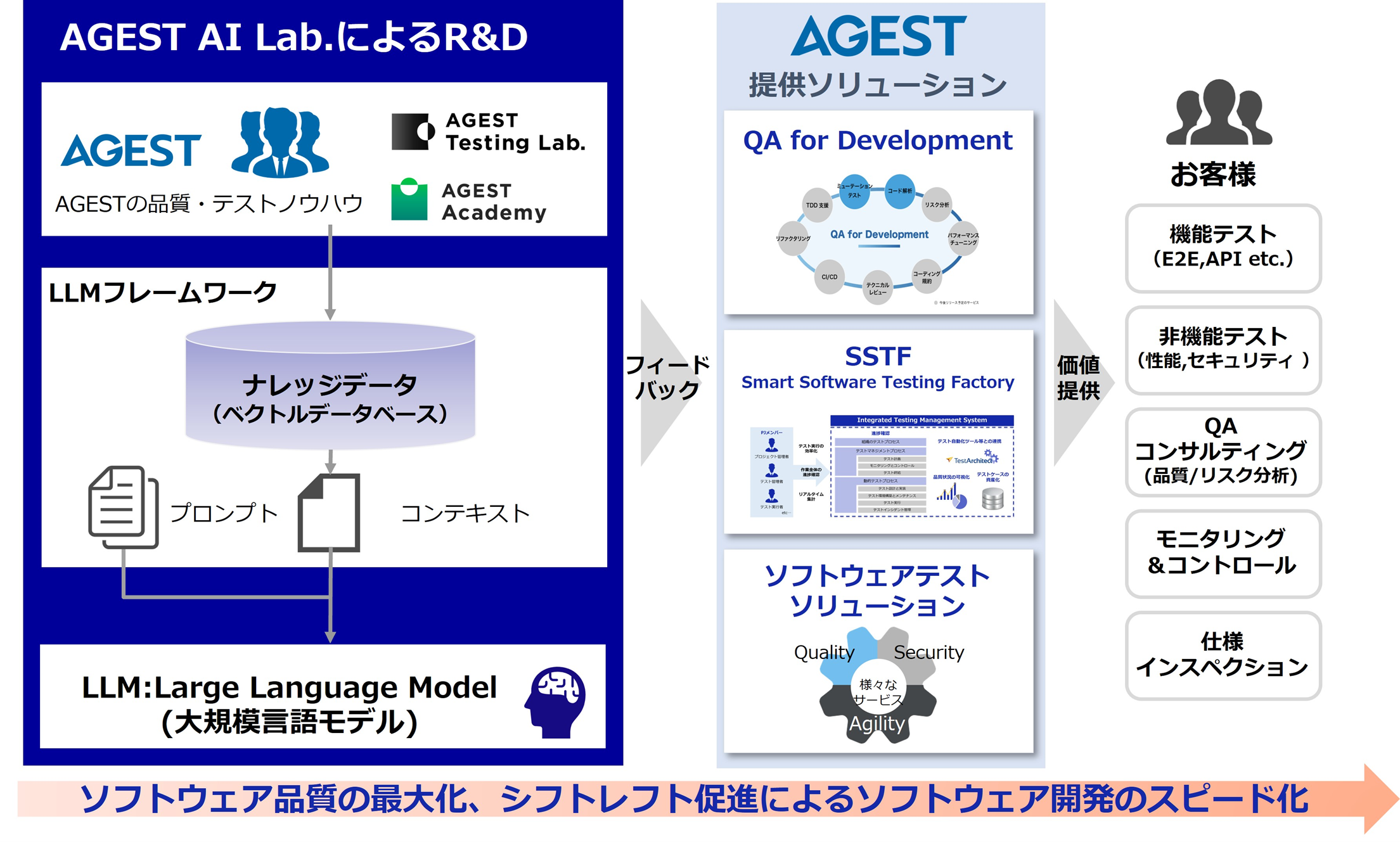 当社は、16,000件を超えるソフトウェアテスト案件の支援実績を通じて培ってきた当社独自のソフトウェアテストのノウハウ、AGEST Academyにおける実践的な業界標準知識及びAGEST Testing Lab.の研究成果などのナレッジを保有しています。この度設立する「AGEST AI Lab.」は、当社取締役副社長CTOの城倉和孝を中心に、次世代QAエンジニアや先端品質技術の知見を有するスペシャリストで構成されたチームであり、当社のナレッジをベクトルデータベースとして蓄積して活用する研究開発などを進めてまいります。また、「AGEST AI Lab.」の研究成果を、当社のソリューションやサービスに迅速にフィードバックすることで、お客様のソフトウェア品質の最大化とシフトレフト促進による開発スピードの加速化へ貢献してまいります。