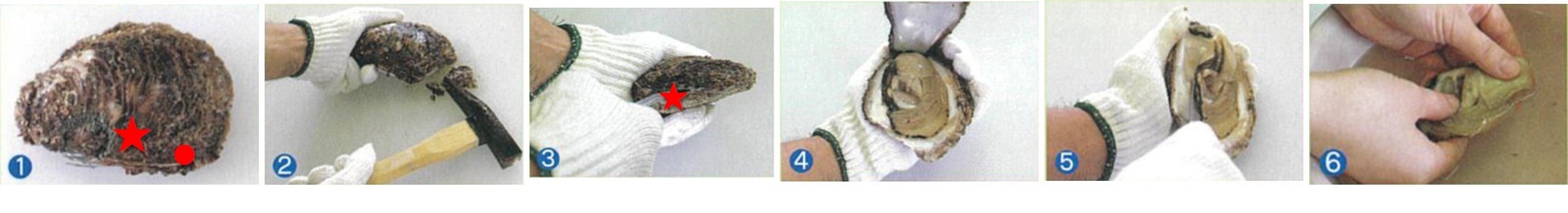 ① ★印が貝柱の位置です。●印のあたりをハンマーで叩きます。