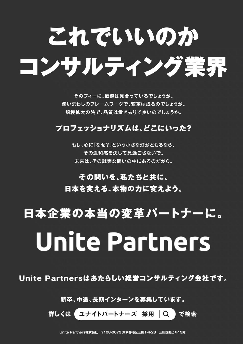 Unite Partnersは、長期にわたりお付き合い出来る、変革の良きパートナーとして認めていただけるよう、常にもっといいコンサルティングのあり方を追求し、お客様からの期待と信頼に応えて参ります。