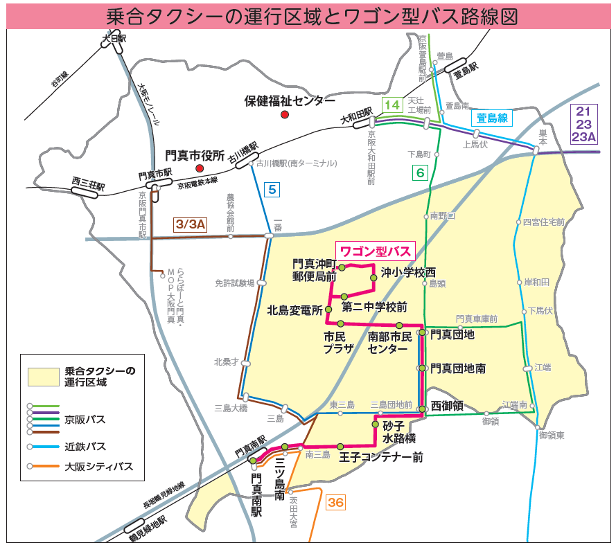 乗合タクシーまたはワゴン型バスから、運行区域内のバス停(京阪バス・近鉄バス)へ乗り継ぐ時は運賃130円を割引します。お出かけの際はぜひご利用ください。