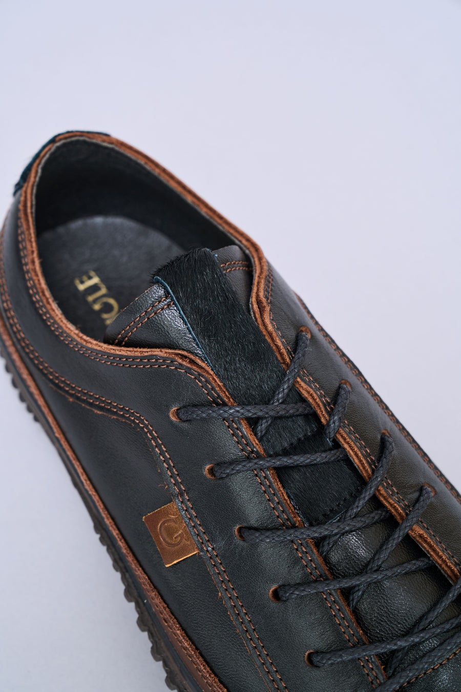 アクセントとして「革の宝石」と称される農耕馬の臀部の革、コードバンをブランドロゴのピスネームに使用しています。