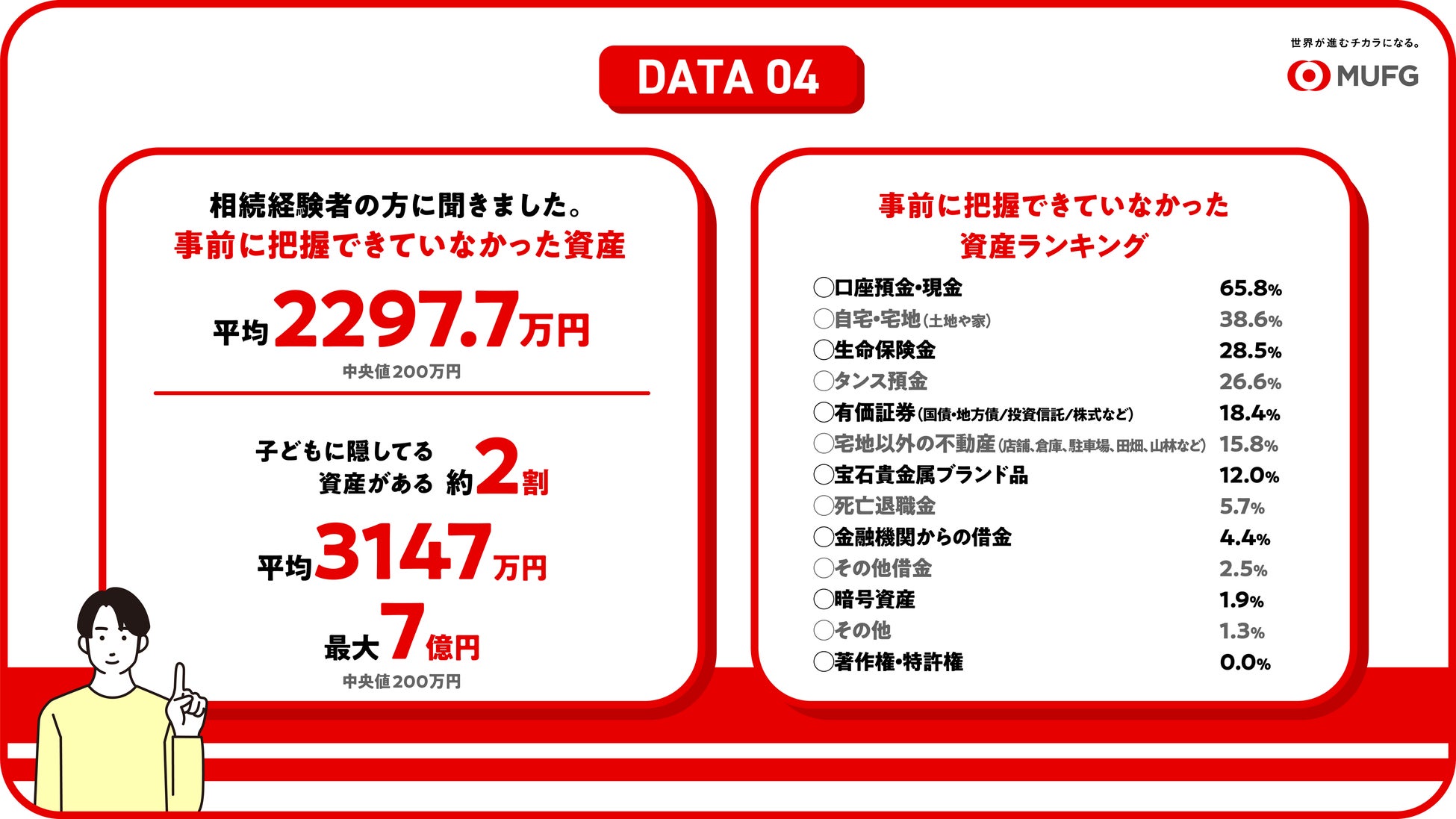 生前に親の財産について、事前にすべて把握していた人は1割にも満たない結果に。未把握の資産は金額にして平均2,297.7万円(中央値300万円)。一方、子ども(※20歳以上)に隠している資産がある親は約2割で、金額の平均3,147万円(中央値500万円)。