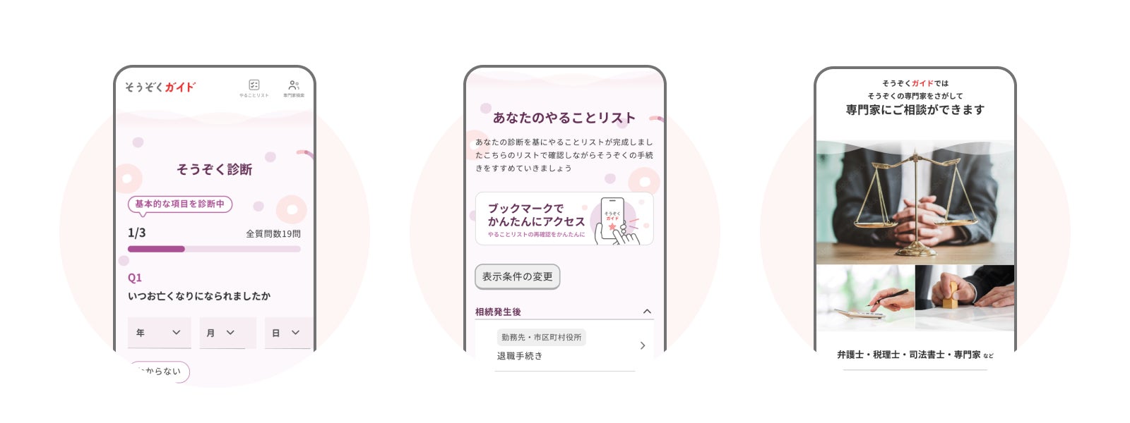 「そうぞくガイド」は、三菱UFJ銀行が2023年7月にリリースした、お客さまが相続手続を円滑に進められるようにサポートする無料のWebサービスです。相続に関する質問に答えると、その回答内容にあわせてお客さま専用の相続手続「やることリスト」が作成され、進捗管理が可能になります。また「専門家検索」機能を使って、弁護士・税理士・司法書士等の専門家を探すことも可能です。