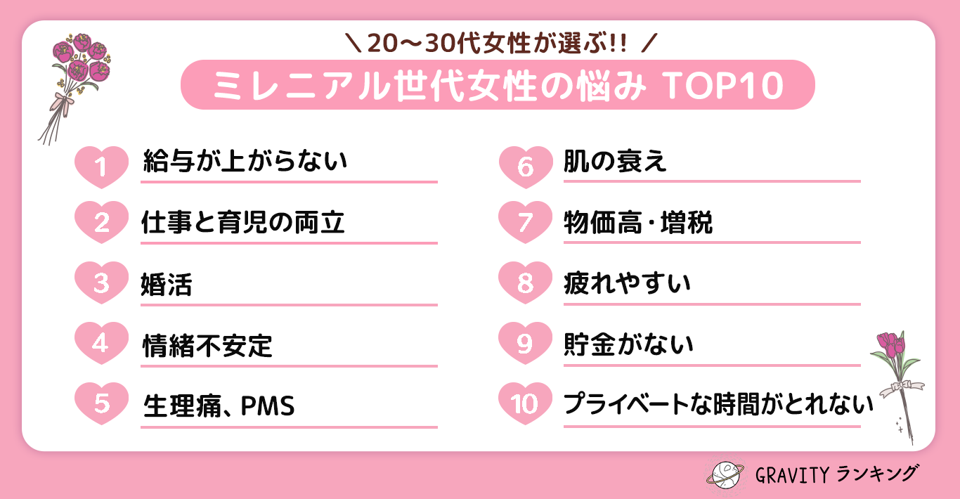 【GRAVITYランキング】20代〜30代女性が選ぶ!!「ミレニアル世代女性の悩みTOP10」