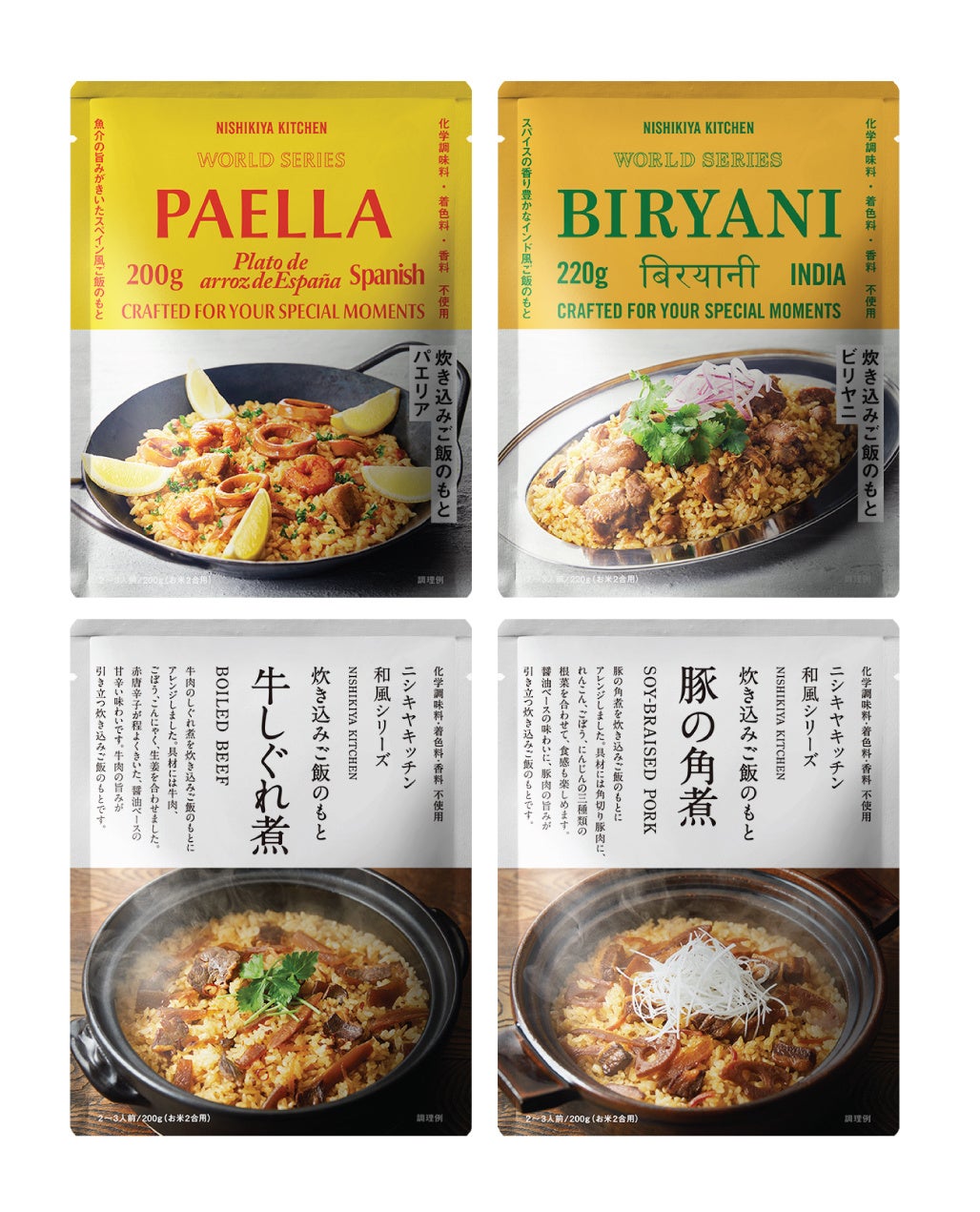 レトルト食品メーカー株式会社にしき食品(本社:宮城県岩沼市、代表取締役:菊池 洋)の自社ブランドNISHIKIYA KITCHEN(ニシキヤキッチン)は、炊き込みご飯のもとを4種類『パエリアのもと』『ビリヤニのもと』『牛しぐれ煮ご飯のもと』『豚の角煮ご飯のもと』を2022年8月18日(木)より発売いたします。炊き込みご飯を一から作るのは手間がかかりますが、レトルト食品に頼ればカンタン。お米と一緒に炊飯器で炊くだけで、本格的な世界の料理を楽しめます。