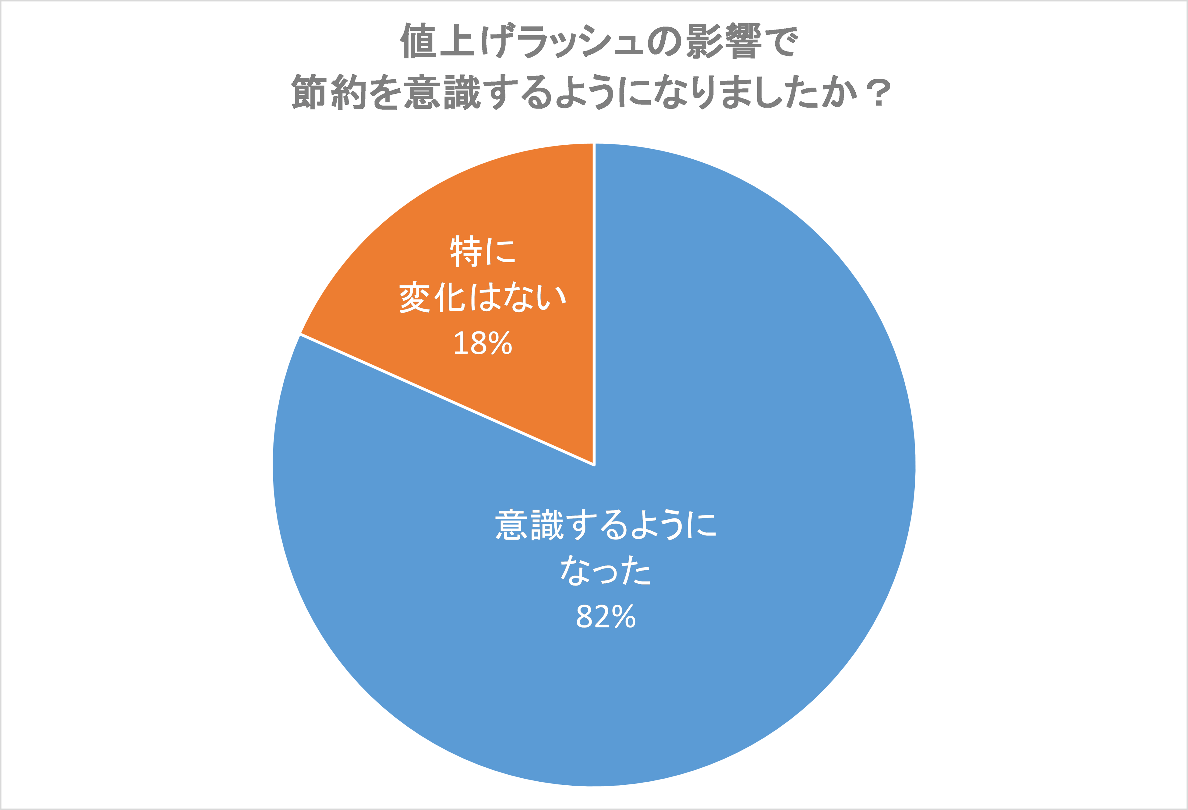 「値上げラッシュの影響で、節約を意識するようになりましたか?」という質問に対しては、「意識するようになった」と回答した人が82%を占める結果となりました。