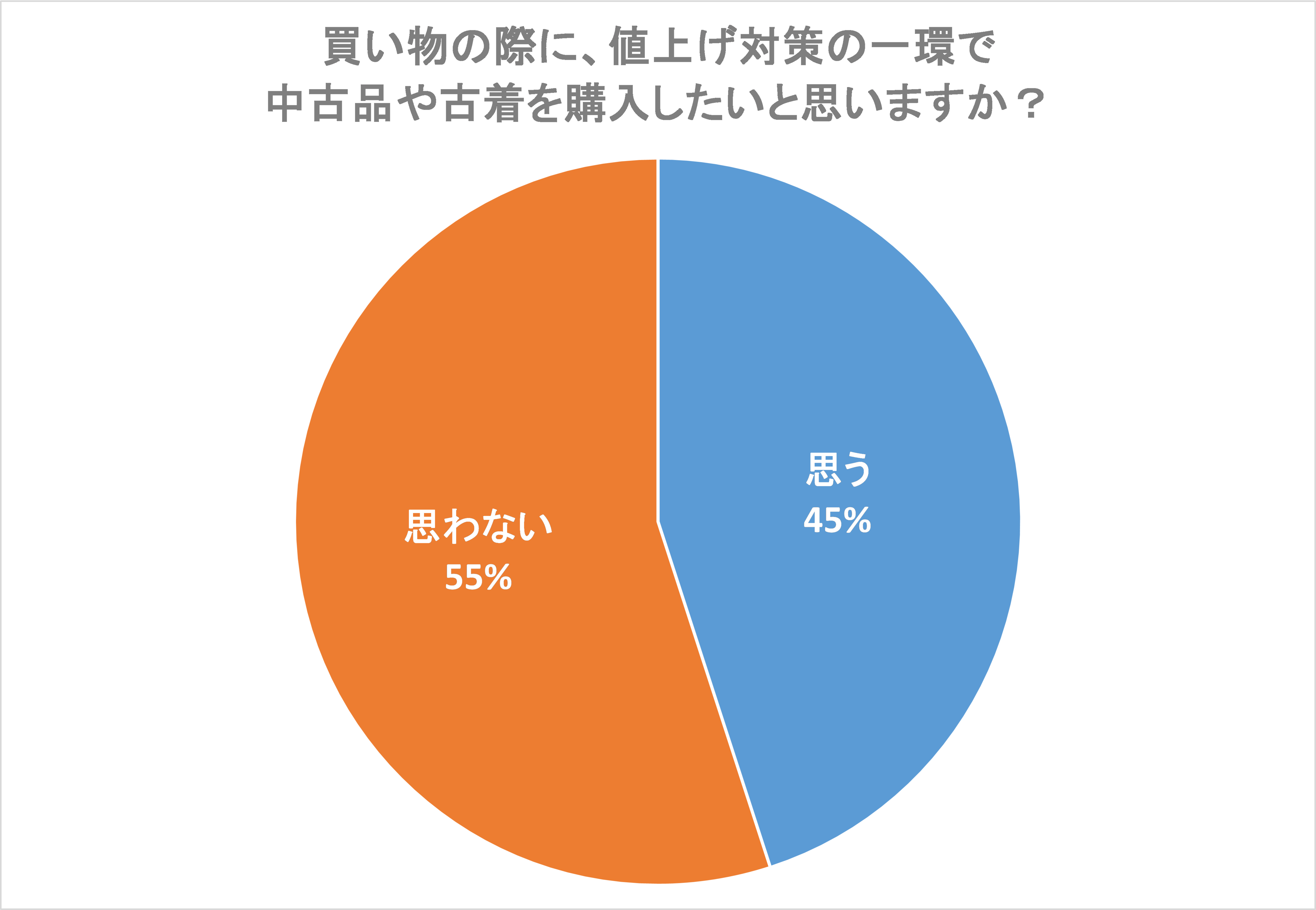 「買い物の際に、値上げ対策の一環で中古品や古着を購入したいと思いますか?」という質問に対しては、「思う」と回答した人が45%、「思わない」が55%という結果となりました。
