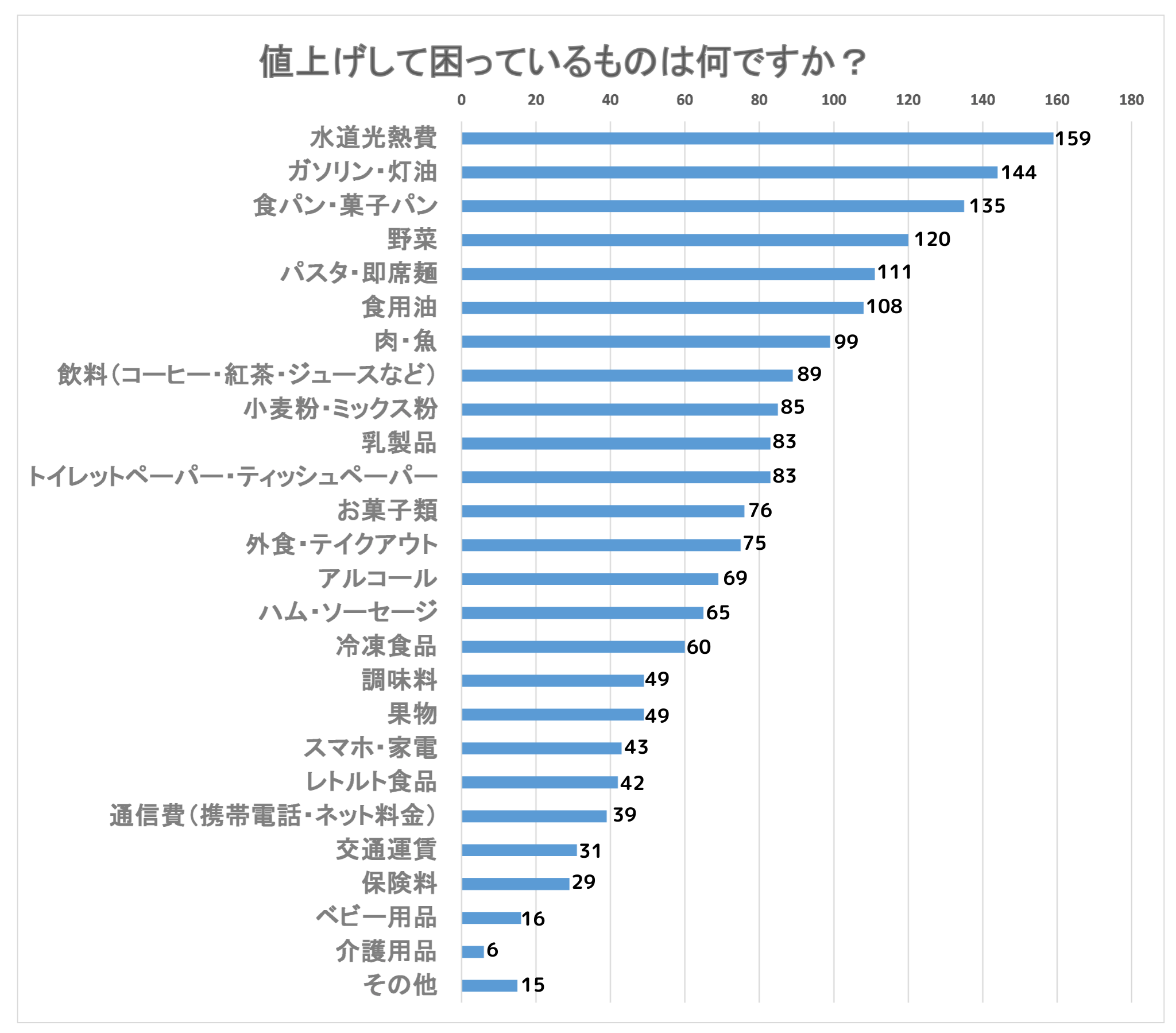「値上げして困っているものは何ですか?」という質問に対しては、「水道光熱費」が159票を集め、144票の「ガソリン・灯油」、135票の「食パン・菓子パン」、120票の「野菜」、111票の「パスタ・即席麺」が続く結果となりました。