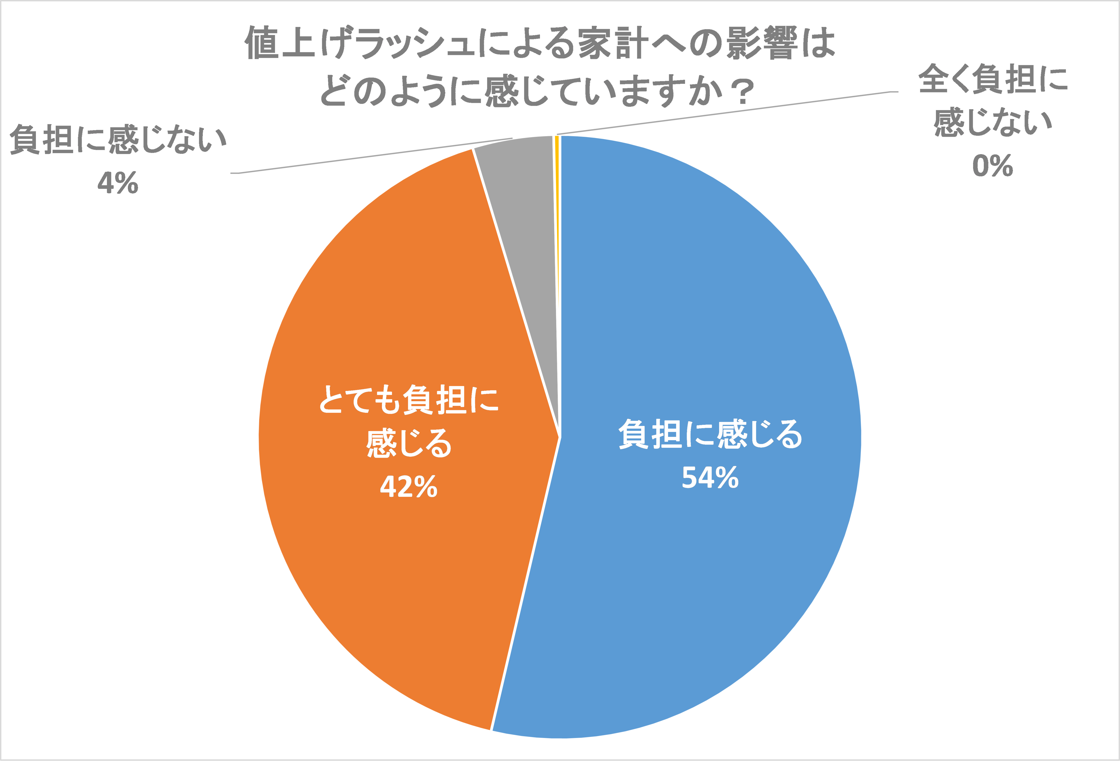 「値上げラッシュによる家計への負担はどのように感じていますか?」という質問に対しては、「負担に感じる」と回答した人が54%、「とても負担に感じる」と回答した人が42%でした。