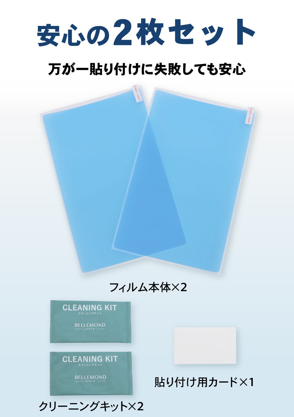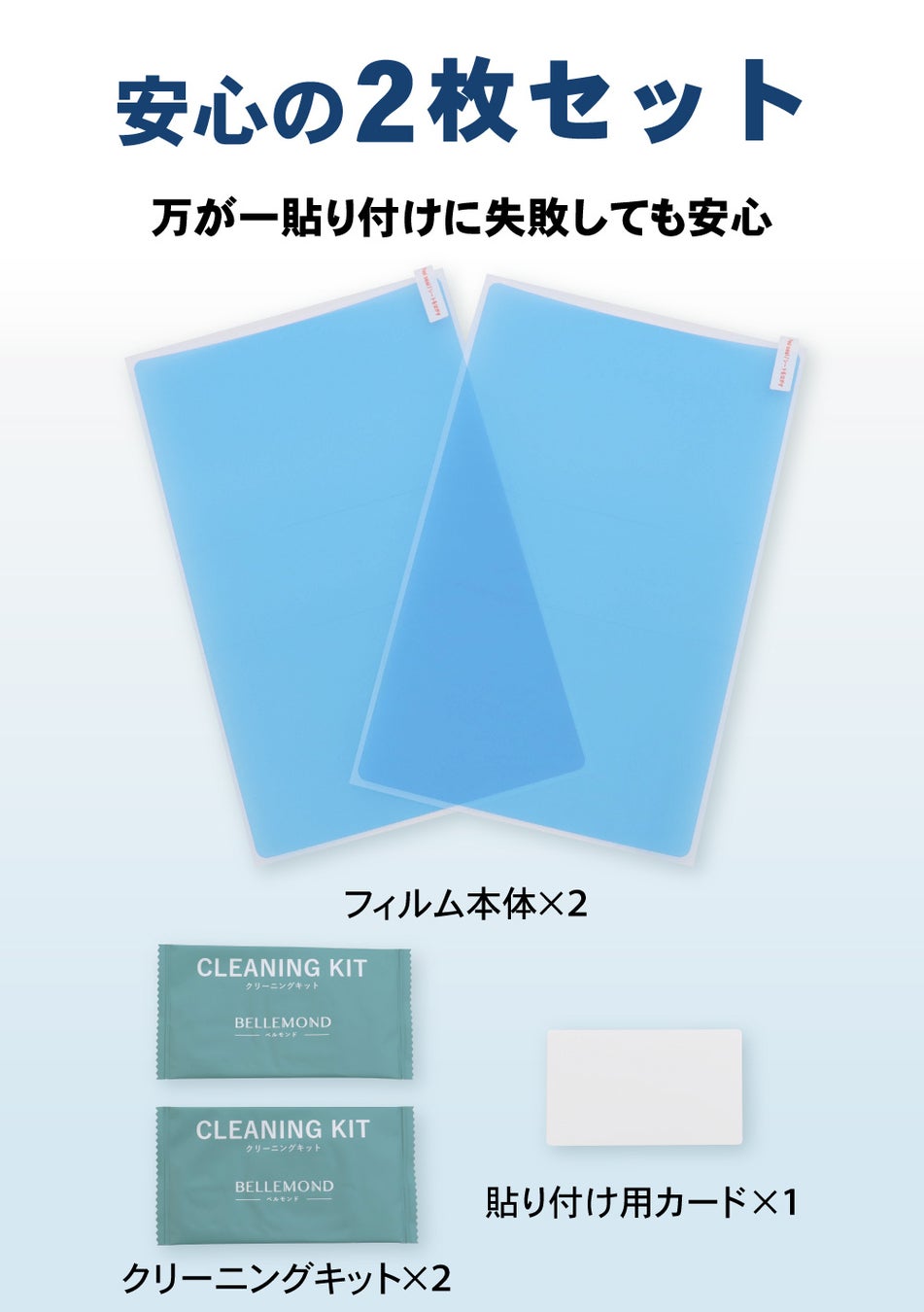 2枚セットのフィルムに加え、クリーニングキットも2つ付いているため、予備としてストックしておくことも可能です。