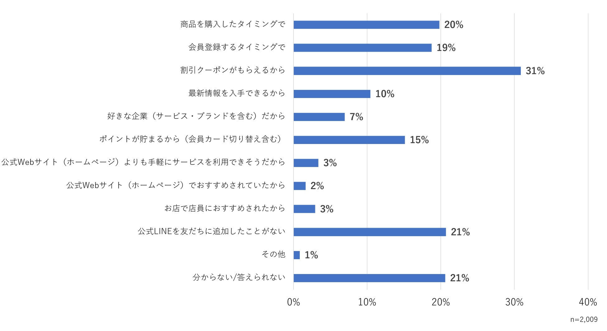 公式LINEを友だち追加するきっかけは「割引クーポンがもらえるから」(31%)が最多。60代以上は「公式LINEを友だちに追加したことがない」人が約30%。