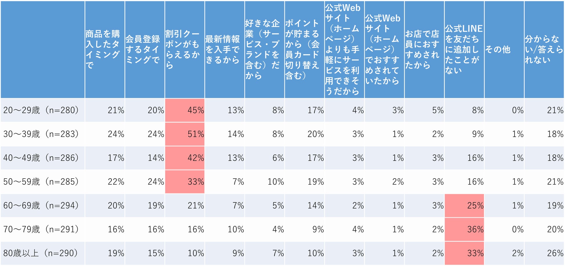 図6の回答を年齢別で見ると(図7)、20~50代は「割引クーポンがもらえるから」が上位となっており、60~80代以上は「公式LINEを友だちに追加したことがない」が一番多い結果となりました。60代以上の世代では、LINEは企業からの情報を受け取る手段ではなく、家族や友人との連絡手段としての活用が多いことがうかがえます。