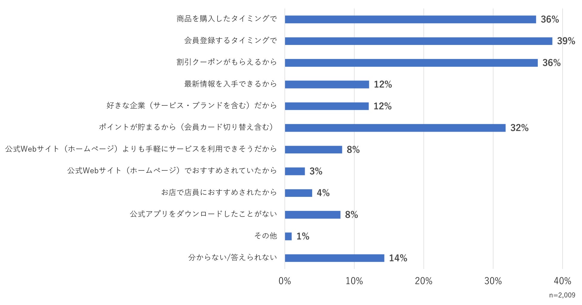 公式アプリをダウンロードするきっかけは「会員登録するタイミングで」(39%)が最多。どの世代でも気軽にダウンロードしている傾向あり。