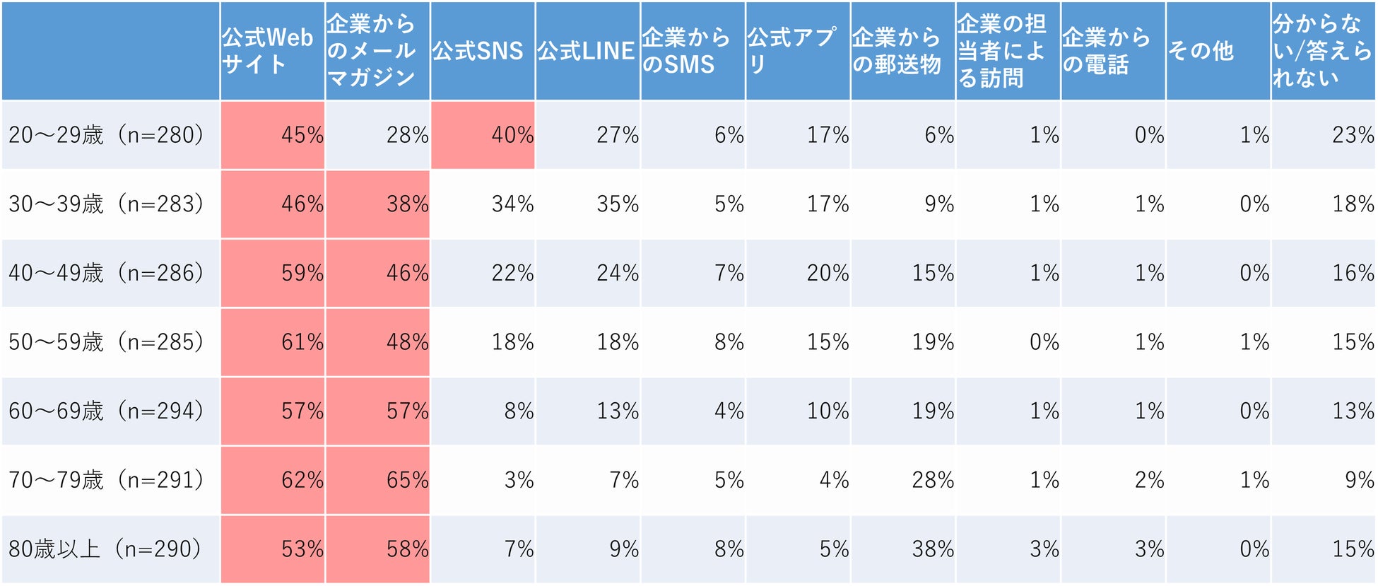 企業からの情報を受け取る手段は「公式Webサイト」(55%)、「メールマガジン」(49%)が多数。20代は「公式SNS」を積極的に活用。