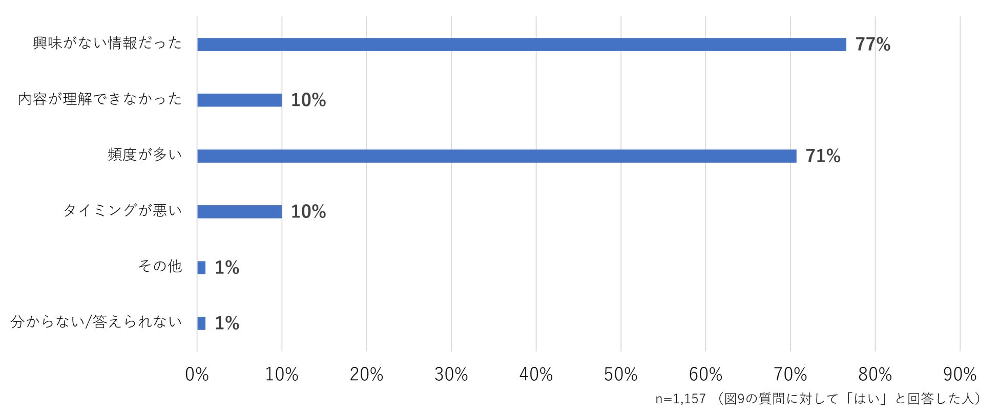 さらに、図9の質問で「はい」を選択した人に対して、「煩わしいと感じたポイントを教えてください」と質問したところ(図10)、77%の人が「興味がない情報だった」、71%の人が「頻度が多い」を選択しました。この結果から、企業へのエンゲージメントを高めるには、その人にとって関心の高い内容を適切な頻度で配信することが重要と考えられます。企業が発信したい情報を一方的に届けるのではなく、受け取り手の興味関心によってアプローチの切り口を変える等の工夫が必要です。