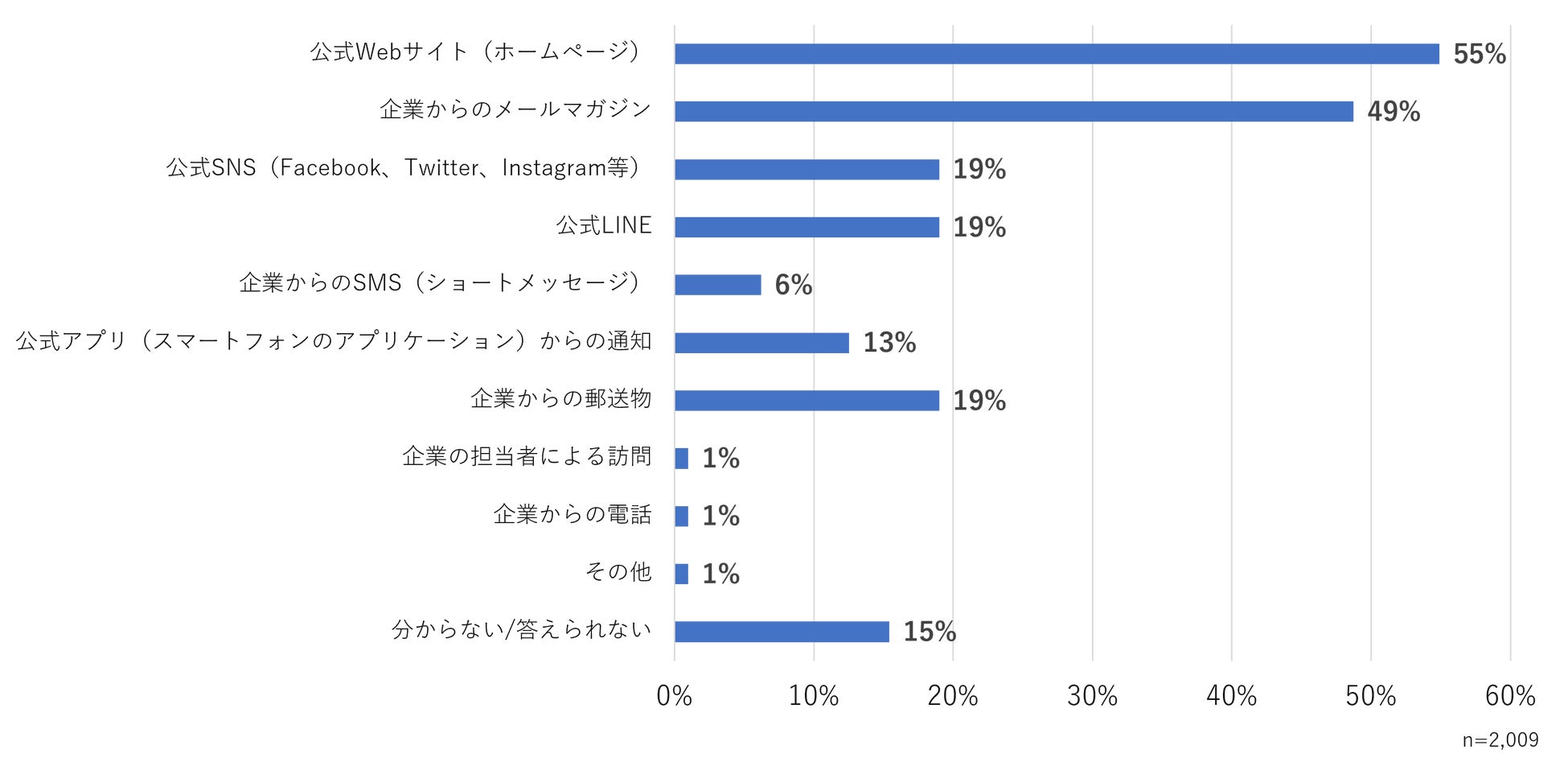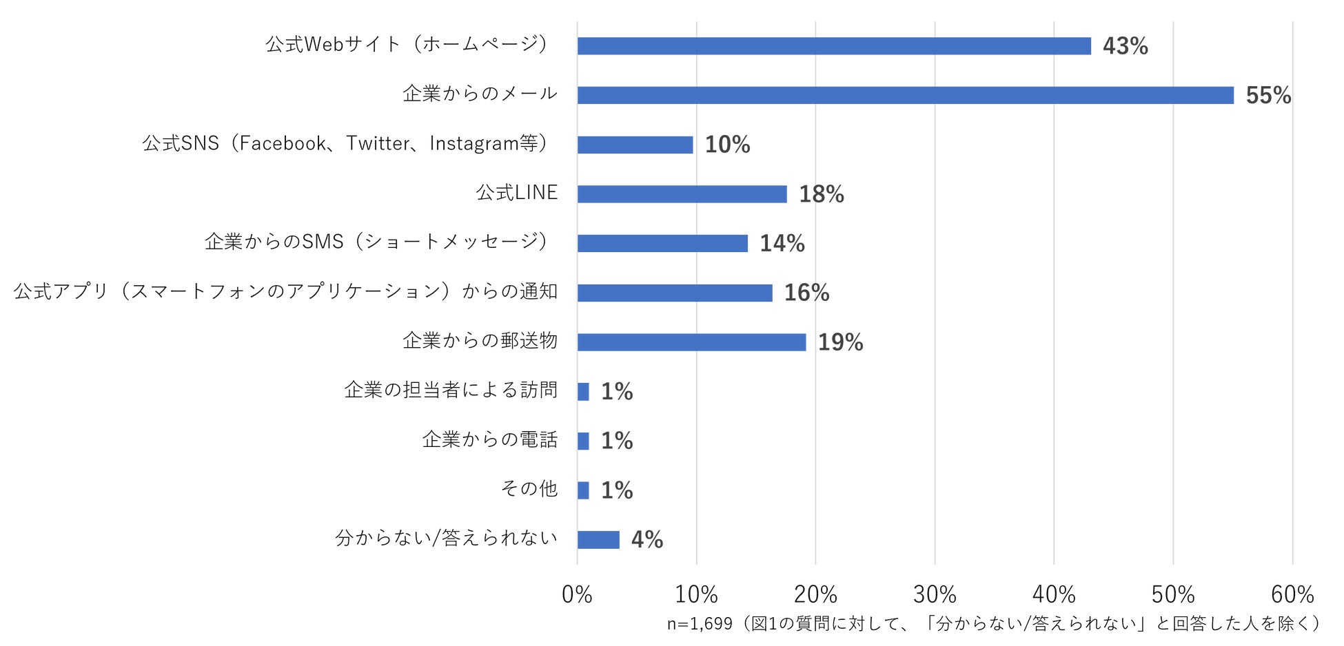 企業からの重要な情報を受け取る手段は「メール」(55%)が最多。「公式Webサイト」(43%)とは10ポイント以上の差。