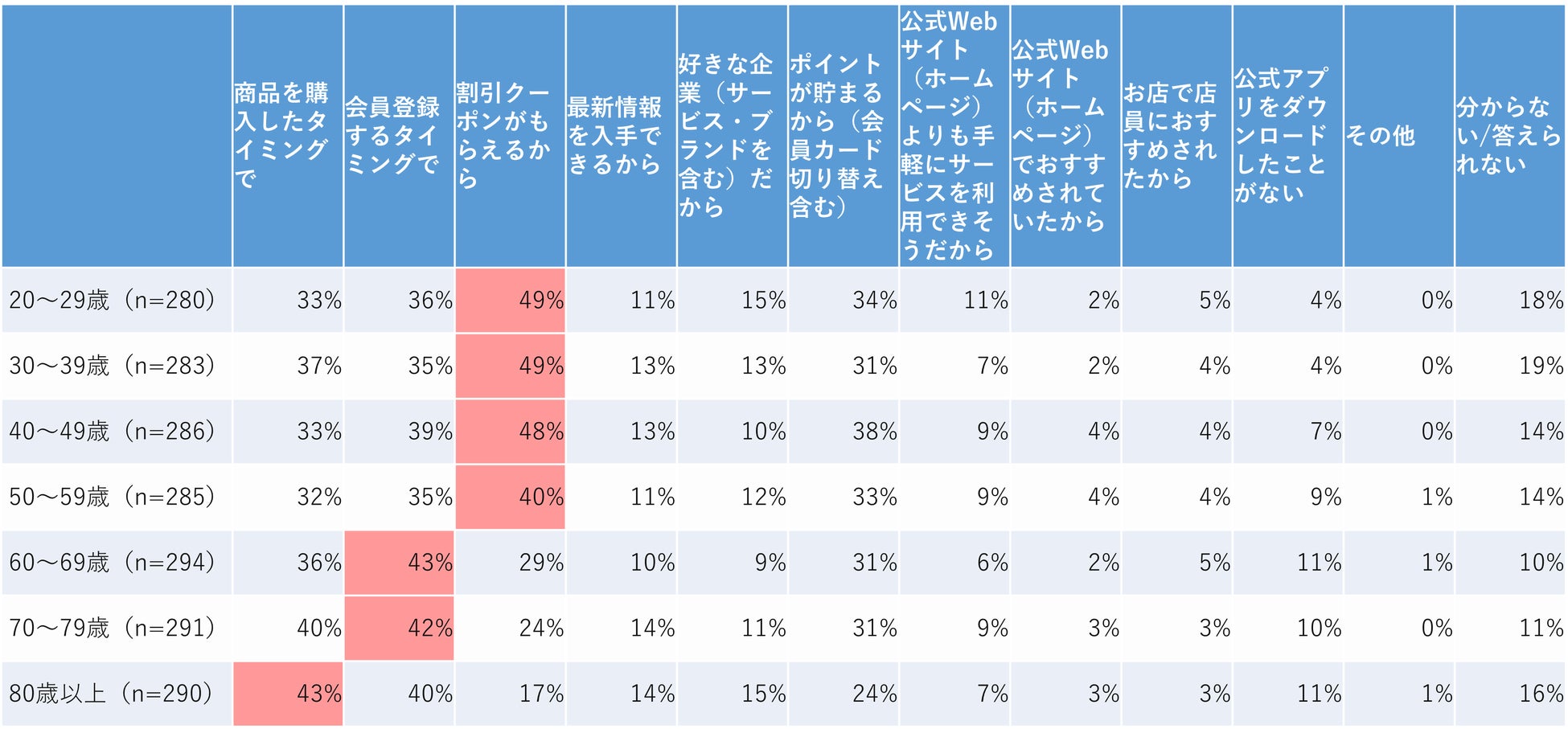 図4の回答を年齢別で見ると(図5)、20~50代では「割引クーポンがもらえるから」、60代以上では「会員登録するタイミングで」「商品を購入したタイミングで」が上位を占めていることがわかりました。「公式アプリをダウンロードしたことがない」を選択した人は50代以下では10%未満、60代以上でも10%前後にとどまりました。スマートフォンが普及し、どの世代でもアプリを気軽にダウンロードする文化になってきているようです。