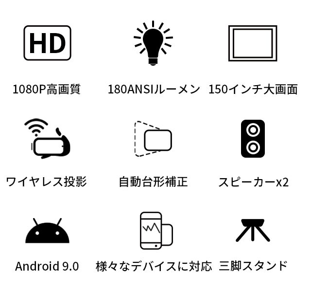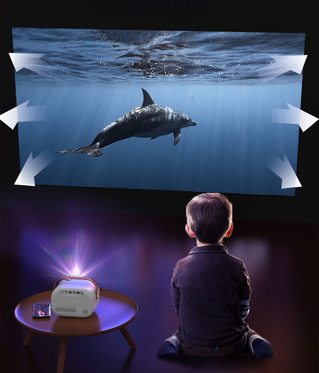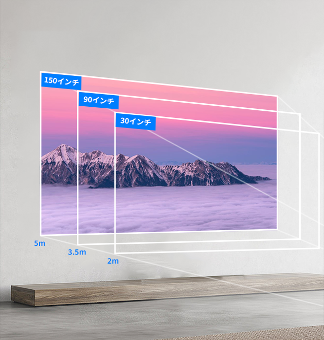 プロジェクターの投射距離によって30-150インチの画面での投影が可能です。スクリーンサイズは投影距離で調整できるので、ご自宅の壁サイズに合わせた距離で投影してください。