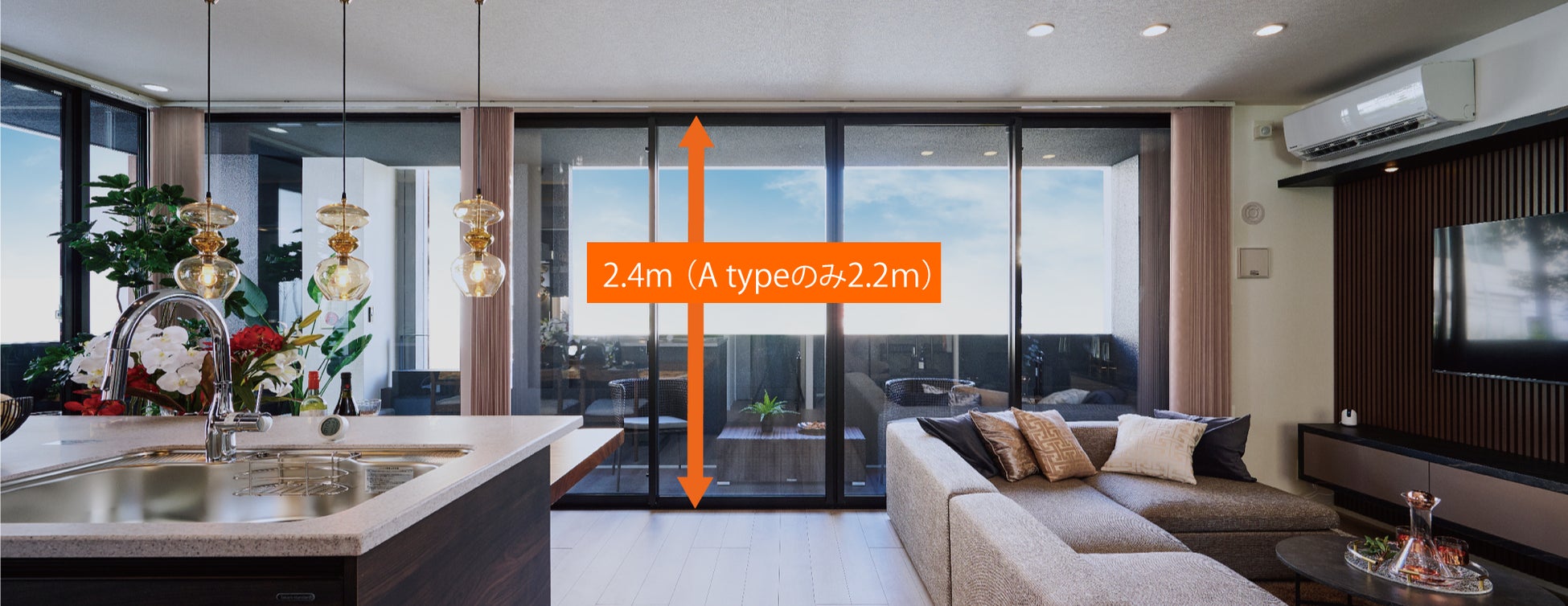 全住戸に南東向きバルコニーがあり、通風・採光・眺望に優れた2.4m(A type のみ2.2m)のハイサッシで、開放感あふれるリビング・ダイニングを創出しています。また、2 方が道路に面した角地に位置しており、都市にありながら周辺の建物との距離が保たれた閉塞感を払拭する恵まれた立地条件にあります。