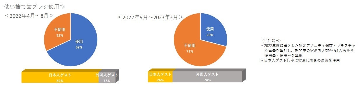 日本人ゲストと海外ゲストの使い捨てアメニティの利用状況を調査するため、MIMARU全施設でのプラスチック製特定アメニティ商品(歯ブラシ・ブラシ・クシ・カミソリ・シャワーキャップ)の使用量を比較したところ、2022年4月~8月(日本人ゲスト率82%)と2022年9月~2023年3月(日本人ゲスト率26%)では、宿泊者1人あたりのプラスチック使用量および使い捨て歯ブラシ使用率は、1/2以下に減少していることがわかりました。MIMARUでは、使い捨てアメニティの配布を終了し、持参の呼びかけを強化してまいります。