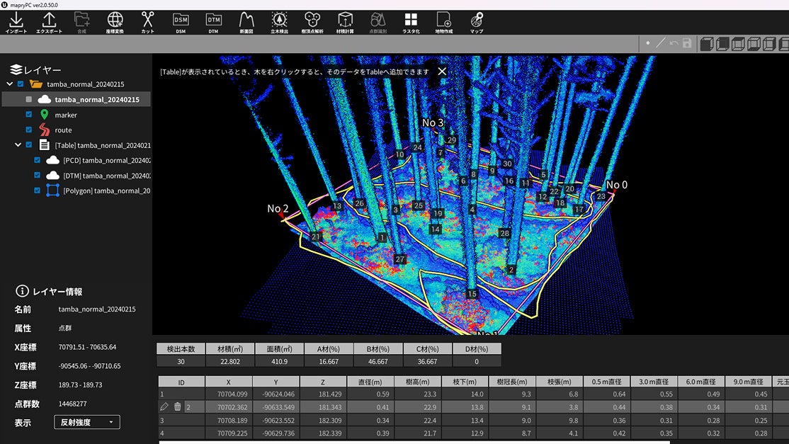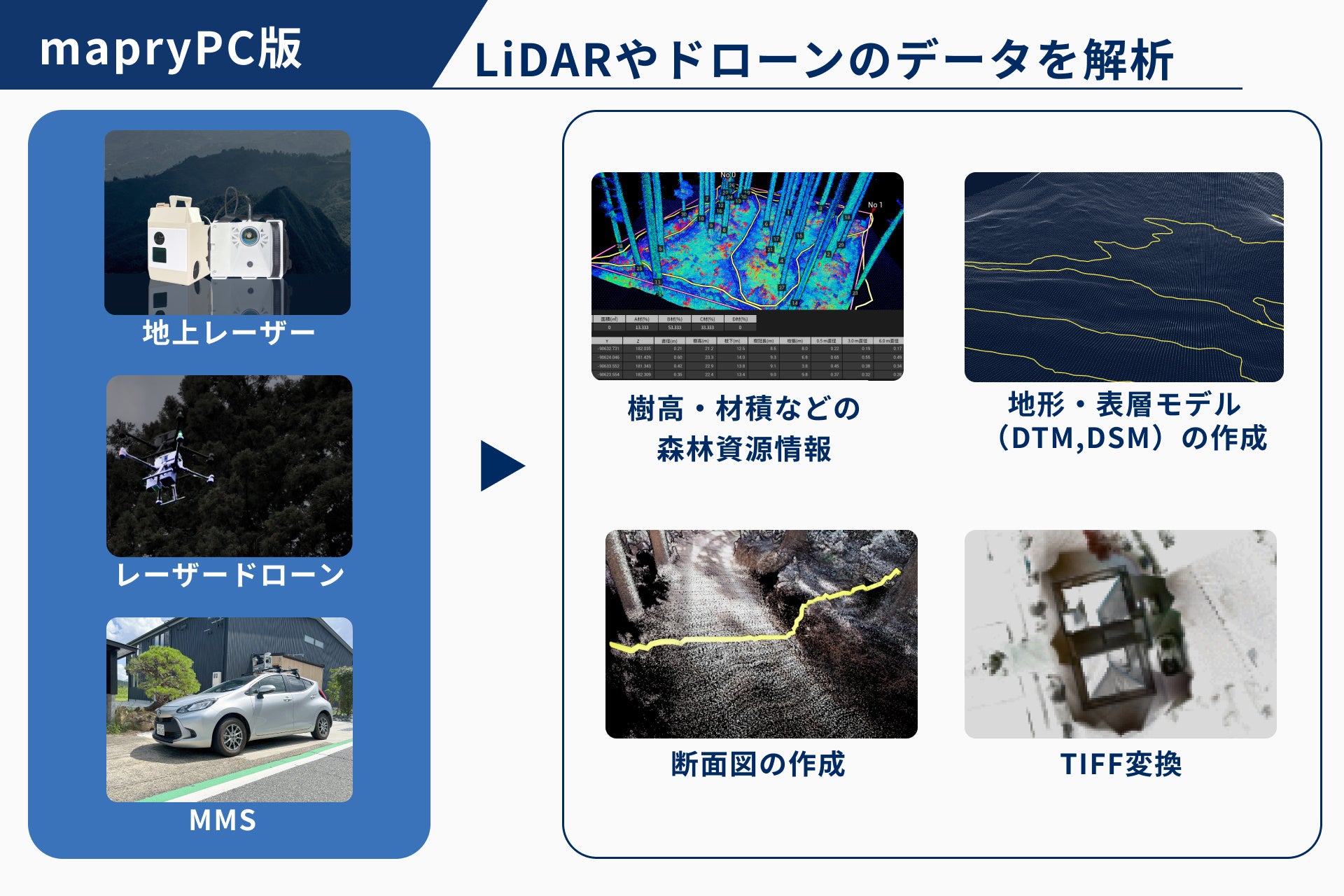「mapryPC版」はLiDARやレーザードローンで計測した点群データを解析できるデスクトップアプリです。立木の樹高や材積の取得、DTMなどの地形データの取得、断面図の作成・TIFF変換等が可能で、森林資源量調査や建設現場等での現況管理にご利用いただけます。