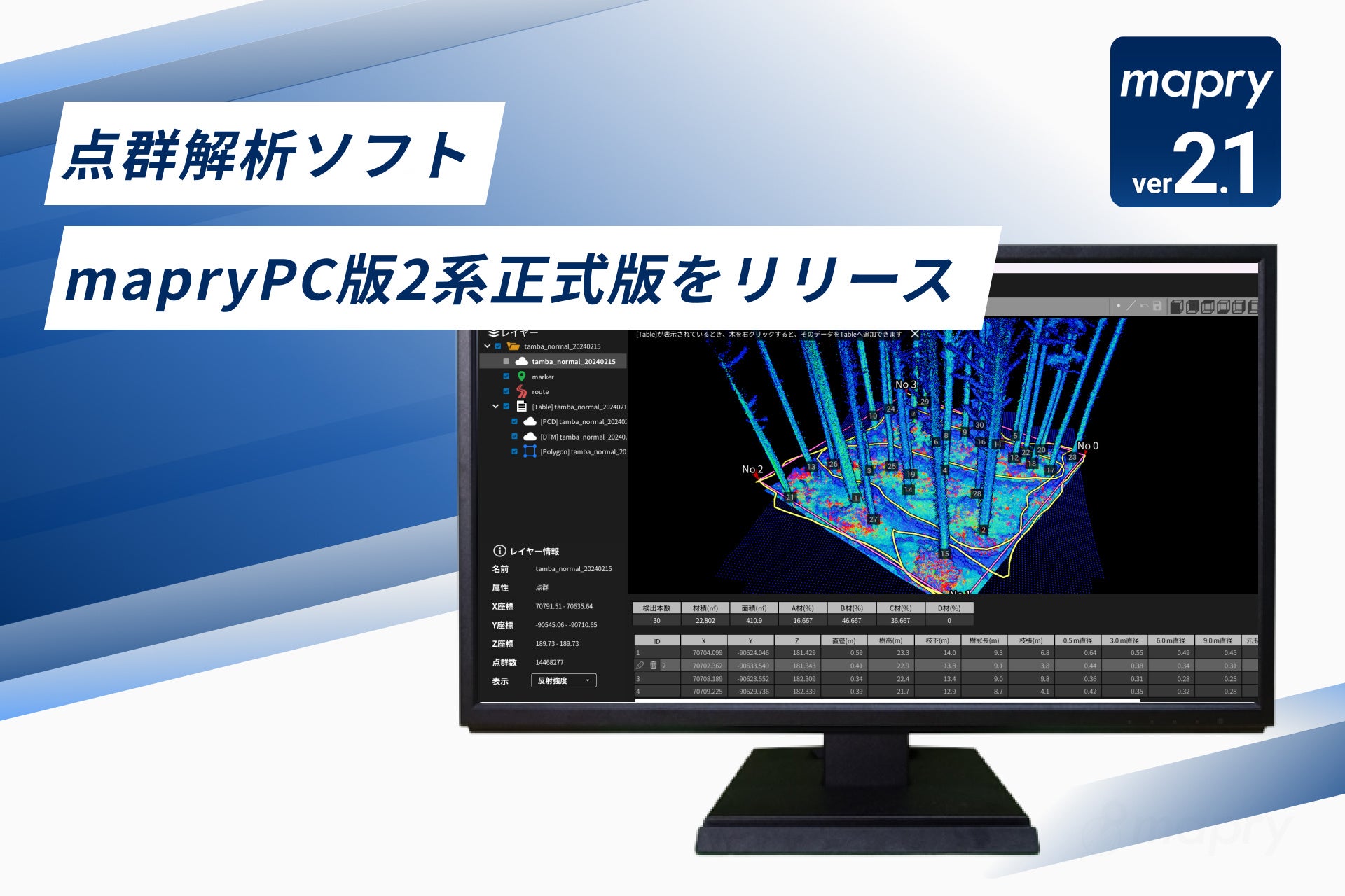 地理空間情報アプリプラットフォームサービス「mapry」を提供する株式会社マプリィ(本社:兵庫県丹波市、代表取締役:山口圭司、以下マプリィ)は、2025年3月7日(金)に点群解析用ソフトmapryPC版2系正式版(ver.2.1.0.0)をリリースしました。1億点以上の大規模データにも対応し、見やすい新ビューワーを搭載したことでよりスムーズに解析を行える仕様となっております。今後はmapryPC版1系のアップデートを終了いたしますので、2系をご利用いただくことを推奨しております(1系の継続ご利用は可能です)。