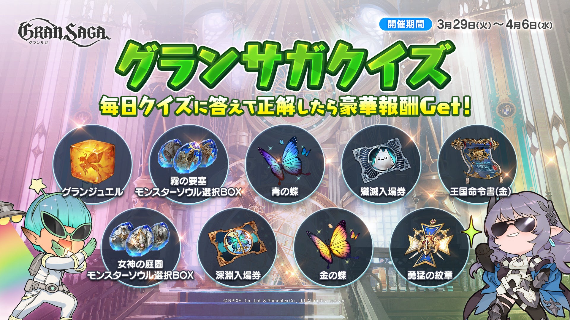 株式会社NPIXELが提供するクロスプラットフォーム対応の王道RPG 「グランサガ(Gran Saga)」(運営:株式会社GAMEPLEX)の公式Twitterにて、毎日出題されるクイズに正解すると豪華報酬が貰える「グランサガクイズ」をスタートいたしました!