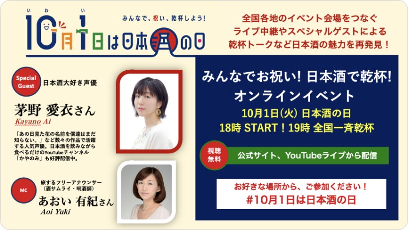 内容: 全国のイベント会場やお店、お家からも!どなたでも自由にご参加いただける「日本酒で乾杯!」オンラインイベント(YouTube LIVE)です。全国各地の会場や海外(台湾、シンガポール、マレーシア、香港)を結んでの中継も行われ、19時にはオンラインで全国一斉「日本酒で乾杯!」を行います。
