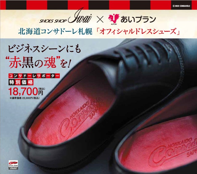 株式会社あいプラングループ(北海道札幌市/代表取締役・新道喜信)のは札幌の老舗靴店IWAIとコラボレーションした北海道コンサドーレ札幌「オフィシャルドレスシューズ」を販売します。スーツや礼服と合わせて着用していただけるフォーマルなデザインの中に、ロゴタイプを素押しした赤のインソールを配置。普段使いにも特別な日にもご利用いただけます。