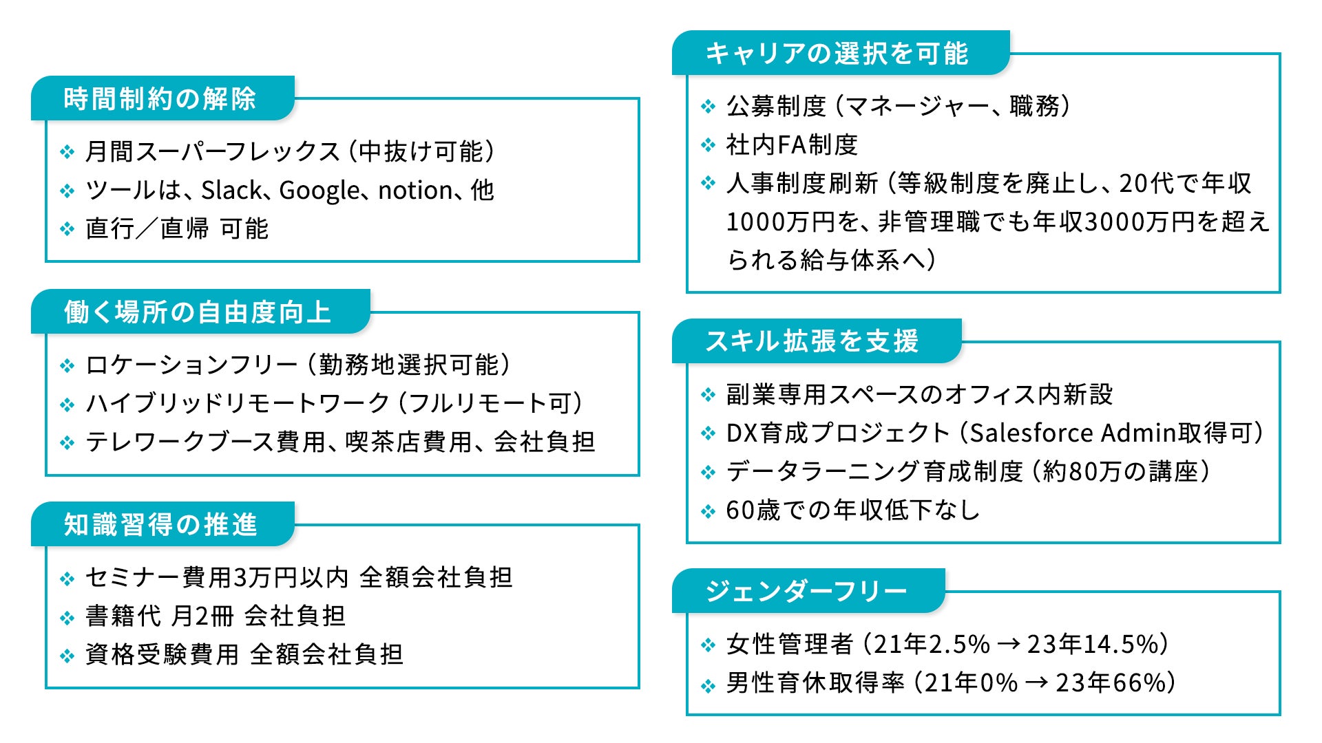 当社では、会社が「意思ある成長が叶い、働くことの制約にならない場所」であるべきと位置付け、「働き方が変わらなければ、ビジネスモデルも変わらない」をコンセプトに約2年間で様々な制度改革を進めてきました。