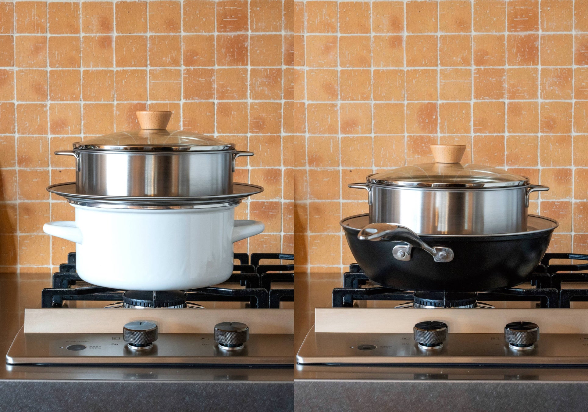 一方、深型は茶碗蒸しやプリンなど高さのある容器に対応し、幅広い料理に活躍します。また、深型に付属しているざるを使えば二段調理も可能で、食材を同時に蒸せるため時短につながり、品数も自然に増やせます。